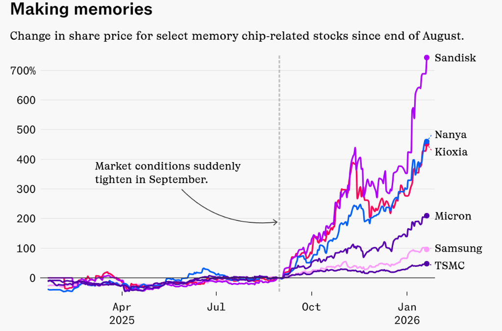 与此同时,高盛分析师也在1月9日上调了闪迪的目标价,并指出“该行业在2026年将处于相当严重的供不应求状态,投资者预计全年价格将出现大幅增长”。随着AI热潮进入第四个年头,市场焦点已从最初的英伟达扩散至更加细分的领域,而闪迪正处于这一新风口的中心。