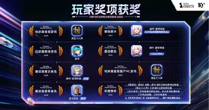 从2016年开始,每年年末,TapTap都会以年度游戏大赏的形式,评选出本年度最好玩、最值得被记住的游戏。起初只有手游,如今已经覆盖到PC领域。