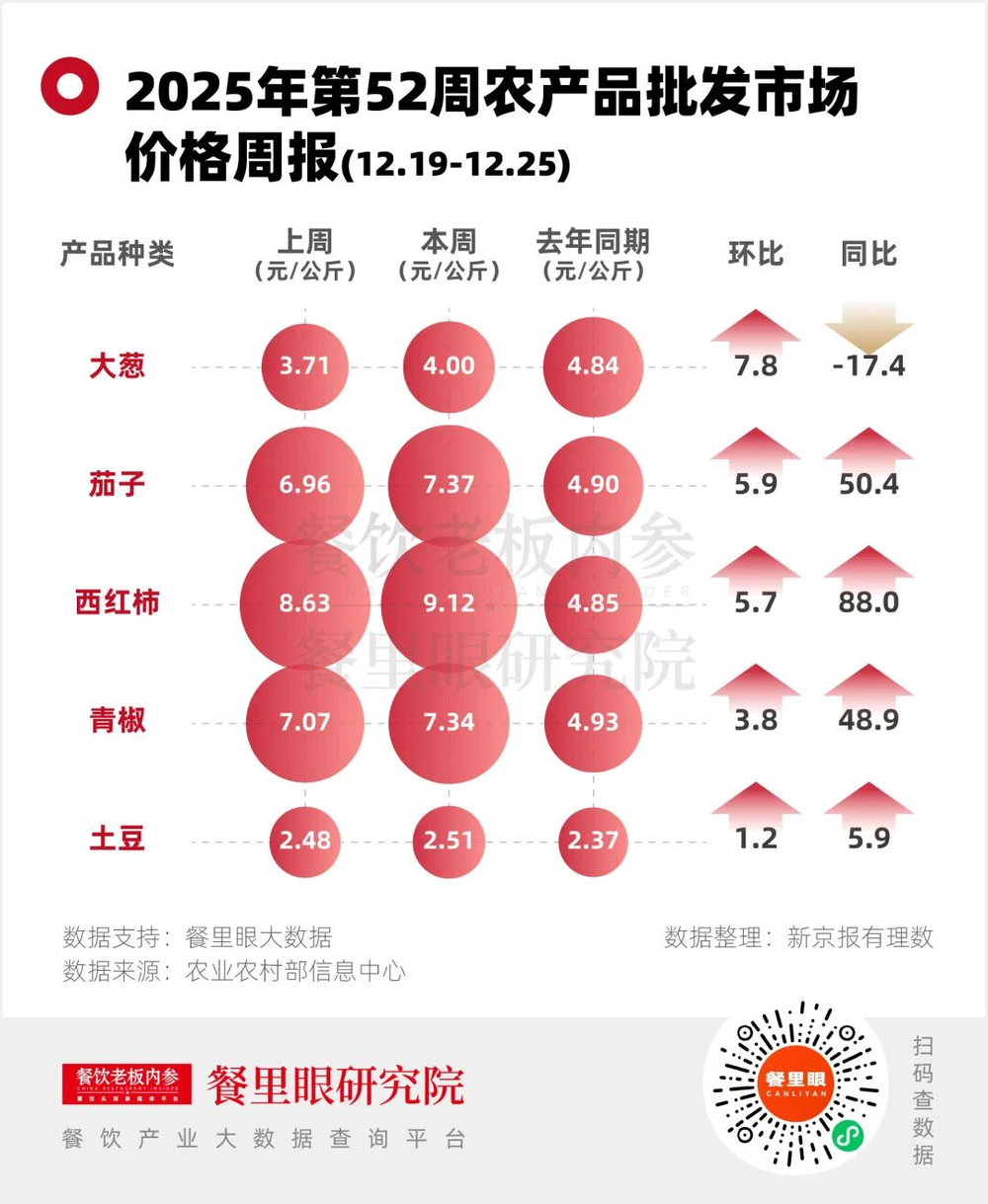 除了肉类,今冬的蔬菜也有点贵。年关将至,餐桌常见的大白菜、西红柿、茄子、青椒等蔬菜食材,也因气候、种植面积等因素全线大涨。其中,西红柿涨价尤为明显。农业农村部信息中心数据显示,2026年1月1日至16日,西红柿平均批发价格为每公斤8.61元,较2025年1月的每公斤4.76元同比上涨80.9%。