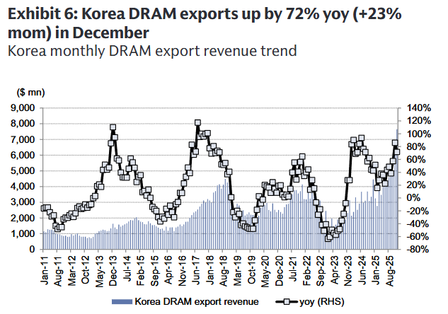 与此同时,韩国12月DRAM出口呈现出强劲的同比增长趋势(同比增长72%),同样是由于DRAM价格上涨所致。