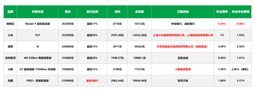 比如小米的「7年低息」由上海小米融资租赁、上海畅途融资两家公司提供,小鹏的由小鹏融资租赁提供,理想则与易鑫集团旗下的天津恒通嘉合融资租赁有限公司合作。