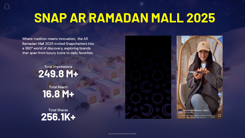 凭借在 AR 领域的技术积累,Snapchat 已连续四年在中东地区推出 AR Ramadan Mall 虚拟购物中心,并将在今年迎来第五次升级迭代。与传统广告不同,这一创新模式以沉浸式、强互动的体验形态重塑消费场景,使用户从被动接收者转变为主动探索者,通过深度交互,进一步提升品牌记忆与情感连接。