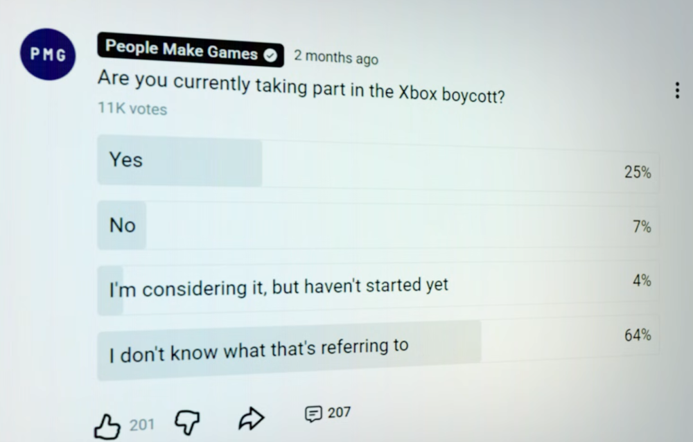 在做采访Arkane的视频前,PMG还在网上发起过一项投票,询问人们是否愿意抵制Xbox,当时大约有一万一千人参与,结果64%的人不懂这是在说什么,只有25%的人赞成。