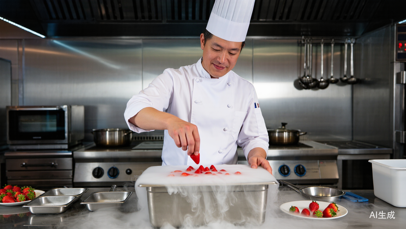 将液氮技术引入厨艺、并将其发扬光大的关键人物,主要集中在分子料理运动的先驱者中。在20世纪90年代,西班牙斗牛犬餐厅主厨阿德里亚开始在他的厨房实验室中大量使用液氮,他利用液氮的极低温特性来创造全新的食物质地,例如将液体瞬间冷冻成粉末、脆片,或者制作超低温的冰淇淋。英国肥鸭餐厅(The Fat Duck)的主厨赫斯顿·布鲁门撒尔(Heston Blumenthal),这是另一位分子料理的泰斗,他在1999年左右就开始在餐厅菜单中推出“液氮冷冻木槿花冰淇淋”(Nitro Frozen Hibiscus Sorbet)等招牌菜,布鲁门撒尔更侧重于利用液氮产生的烟雾效果来增强用餐的戏剧性和感官体验,让食客在视觉和味觉上同时获得震撼。美国“The French Laundry”餐厅主厨托马斯·凯勒(Thomas Keller)在他的著作《The French Laundry Cookbook》中收录了一道著名的“液氮冻梨”(Frozen Pear)甜品,他将液氮引入美式高端料理厨房,展示了这项技术不仅属于“前卫科学”,也能服务于经典的烹饪美学。