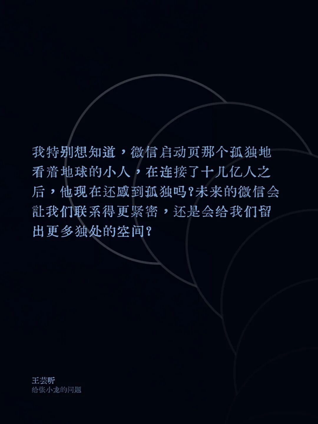 “我特别想知道,微信启动页那个孤独地看着地球的小人,在连接了十几亿人之后现在还感到孤独吗?未来的微信会让我们联系得更紧密,还是会给我们留出更多独处的空间?”