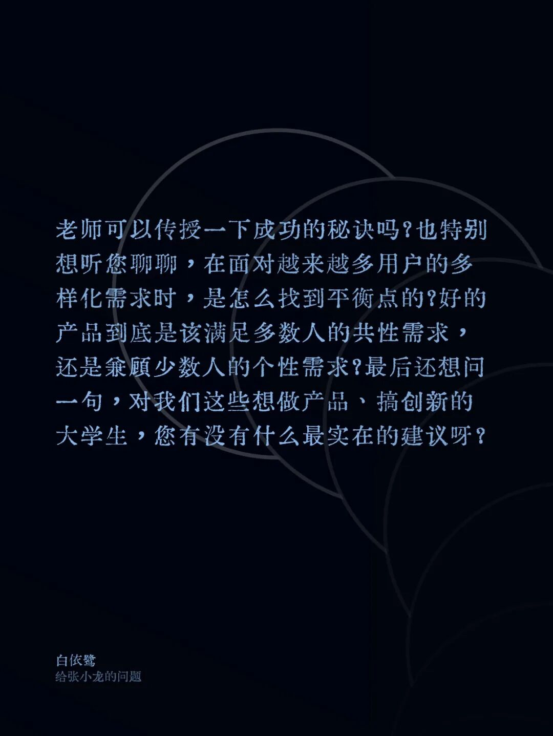 “教张小龙做微信确实是个老梗了。外界对他的评价,无论是封神还是调侃,都只是外界的投射。他当然是非常优秀的产品经理,回顾微信历史上的很多重要的时刻,他都有正确的判断。但是产品进到国民级之后所承受的压力,是外界无论怎么代入都无法想象的。”