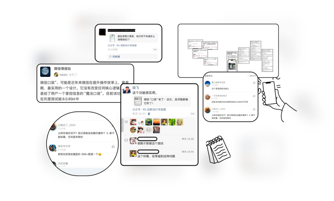 于是王芸昕设计了“微信口袋”。无论是一个链接,或者只是选中的一段文字,都可以在微信的任何界面上随时装进这个口袋,从屏幕边缘轻轻一划就能打开。没读完的文章、下载后打开过的文档、没填完的在线表格,全部暂存在这里......