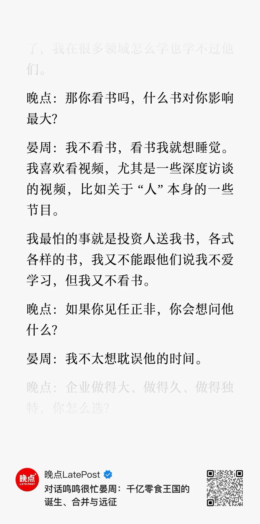 文章里边有两个其实非常无趣、非常套路化的提问,但是鸣鸣很忙的董事长兼CEO晏周却给出了两个出人意料、完全“非常识”的非标回答。