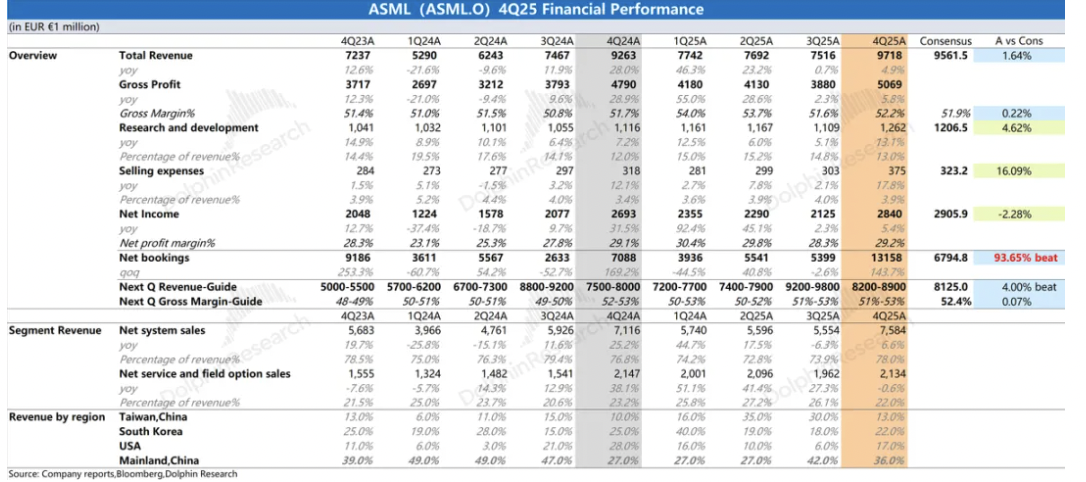 1.2收入端:阿斯麦(ASML)在2025年第四季度实现营收97.2亿欧元,同比增长5%,好于市场预期(95.5亿欧元)。收入同比增长,主要来自于中国大陆地区客户贡献。