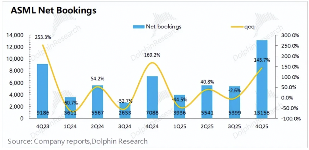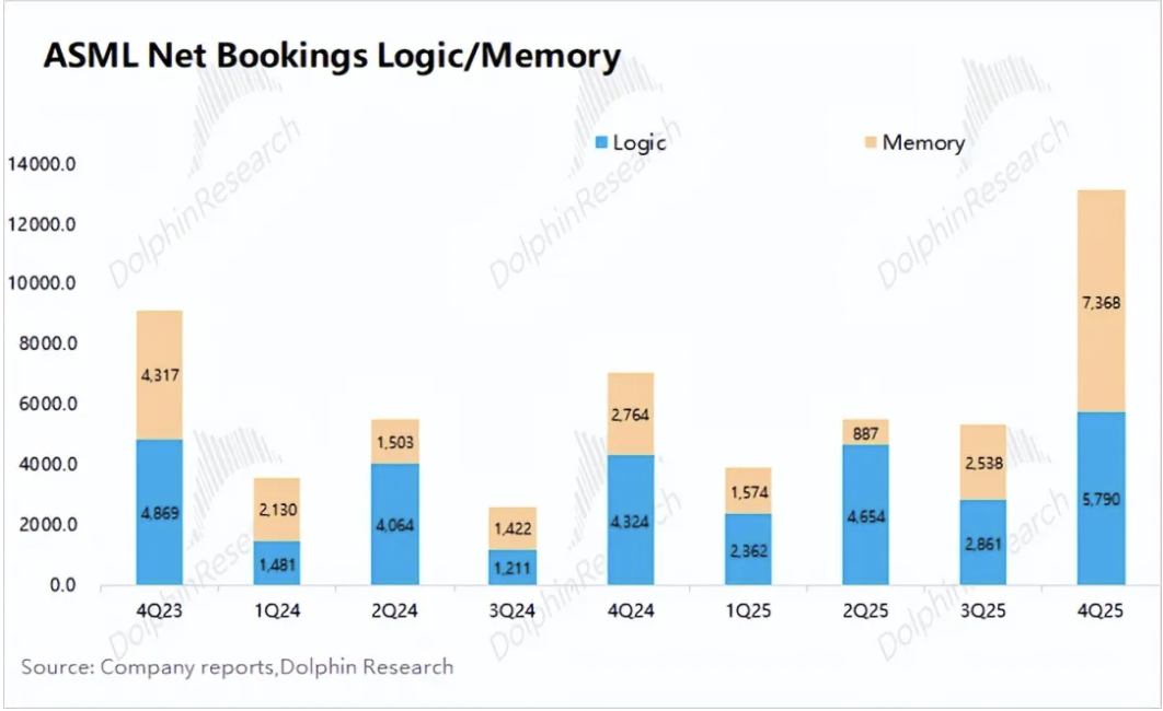 具体来看:①逻辑类订单:本季度为58亿欧元,环比增量30亿(符合季节性波动);②存储类订单:本季度为74亿欧元,环比增长49亿(远好于历史同期)。