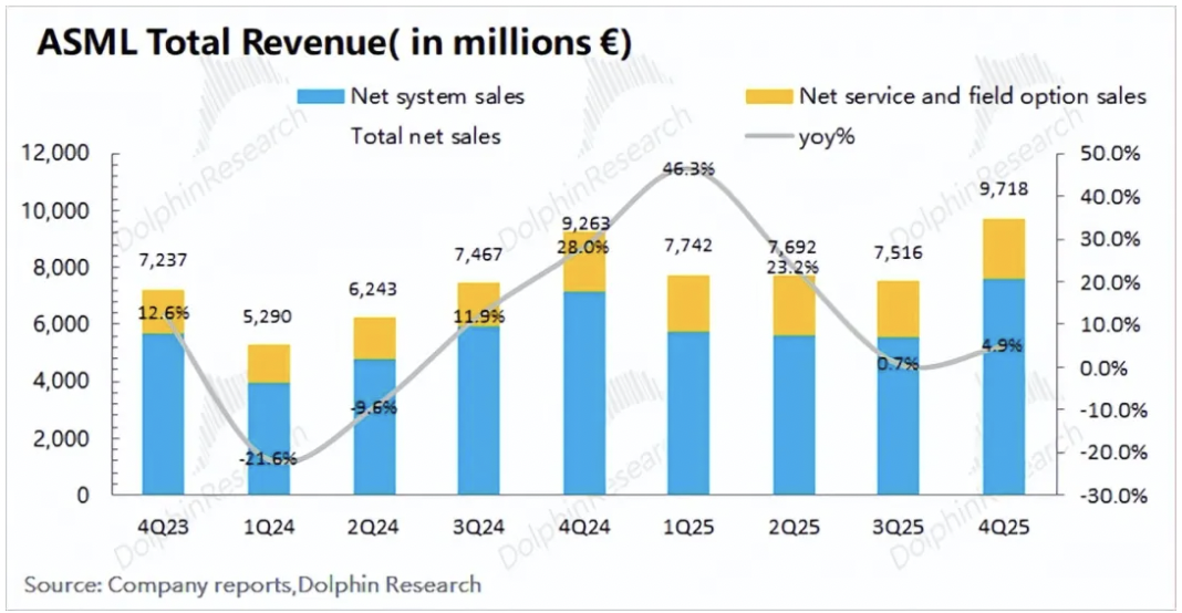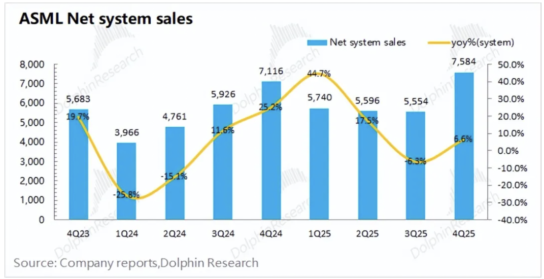 阿斯麦(ASML)的系统销售收入在2025年第四季度实现75.8亿欧元,同比增长6.6%,其中本季度EUV、ArFi和ArF Dry等核心设备都有不同幅度的增长。