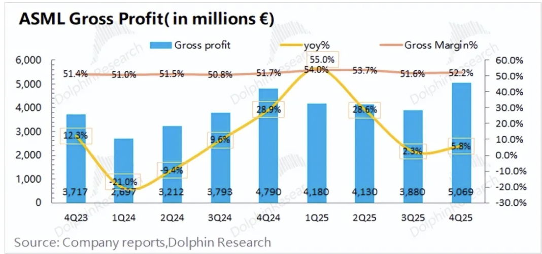 1.3毛利及毛利率:阿斯麦(ASML)在2025年第四季度实现毛利50.7亿欧元,同比增长5.8%。其中毛利率方面,公司本季度毛利率52.2%,同比提升0.5pct,符合公司指引区间(51%-53%),主要是受价格较高的EUV收入占比提升的带动。