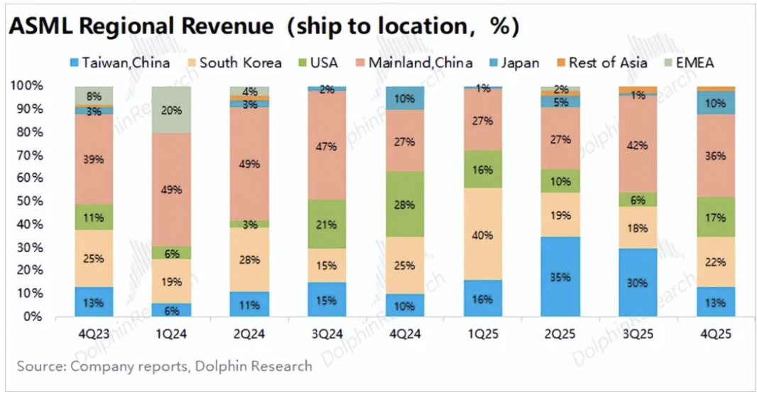 阿斯麦ASML披露的地区收入,是以“ship to location”的口径。因而台积电将2026年资本开支再次提升至520-560亿美元,大幅增加的资本开支不一定全部体现在中国台湾地区的收入中,其中一部分也会在台积电美国工厂中,可能会带动中国台湾地区和美国地区两项占比的回升。