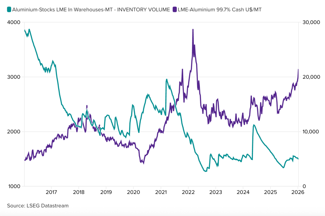 当前伦敦金属交易所(LME)铝的现货库存也出现了下降。最新数据显示,截至2026年1月26日,伦敦金属交易所可交割库存降至50.53万吨,下降幅度约为0.4%。虽然看似不大,但在可流通库存本就偏低的背景下,会在需求集中释放时迅速形成供给压力,从而放大价格波动幅度。