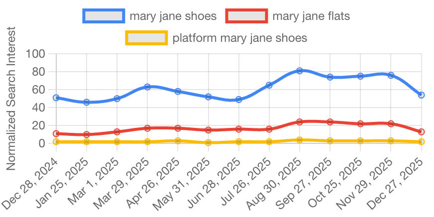 Google搜索数据显示,去年下半年各类“玛丽珍鞋”的搜索指数显著上升,直观反映出消费者的好奇心与潜在购买意愿正在持续增长。