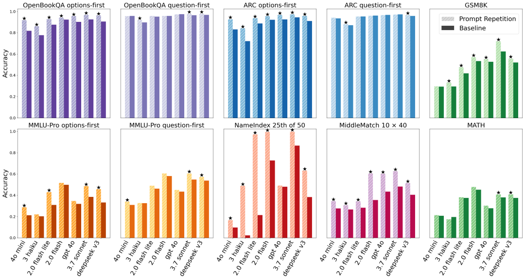 这听起来匪夷所思,但数据说明一切:在不使用链式推理的任务中,仅靠复制+粘贴地重复提示词,某些模型的准确率竟从21%飙升至97%,提升幅度高达76个百分点,这个世界可太疯狂了...