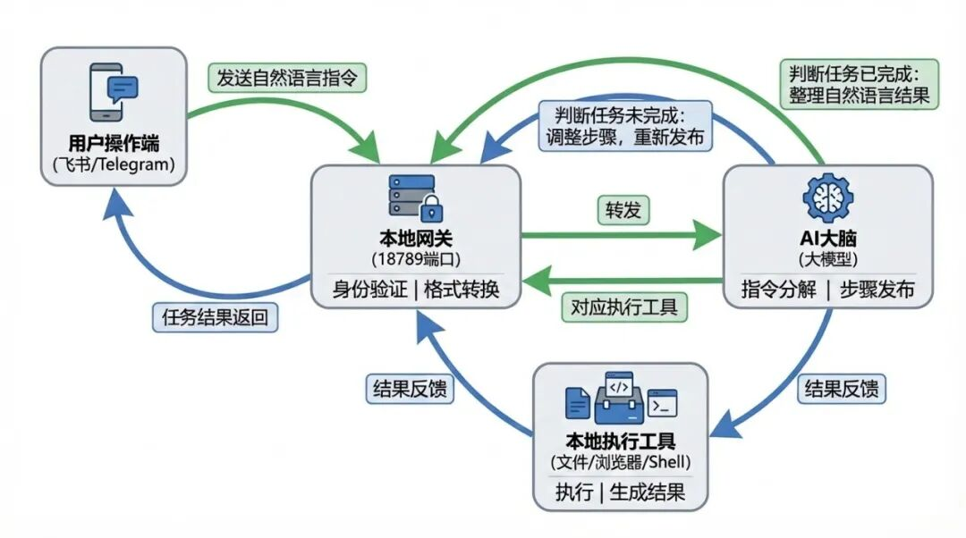 用户发送自然语言指令给本地网关,这个网关就是你在本地电脑上的一个后台服务。