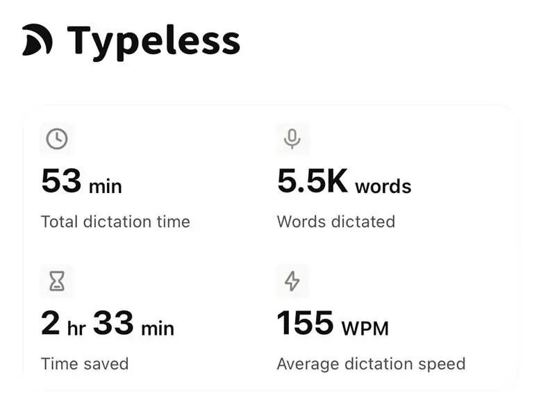 甚至连这篇文章的初稿,也是用语音输入完成的。我专门申请了另一个Typeless账号,记录完成这篇文稿的数据:用时53分钟,输入5500字,每分钟155字,节省2.5小时。