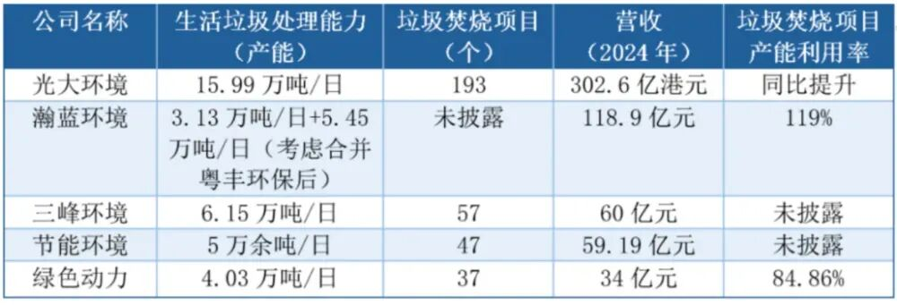 部分垃圾焚烧类上市企业的业务数据图源:每日经济新闻