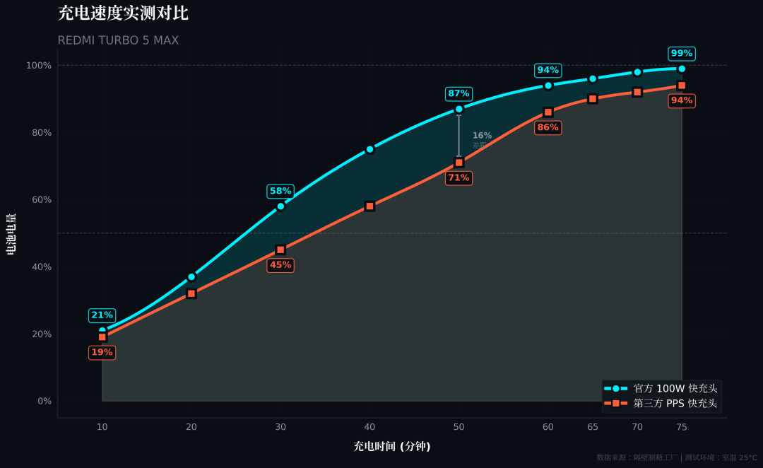 根据隔壁制糖工厂录得的数据,分别使用原装的100W小米快充头和第三方高功率PPS快充头,红米Turbo 5 Max的实际满充速度几乎是肩并肩的: