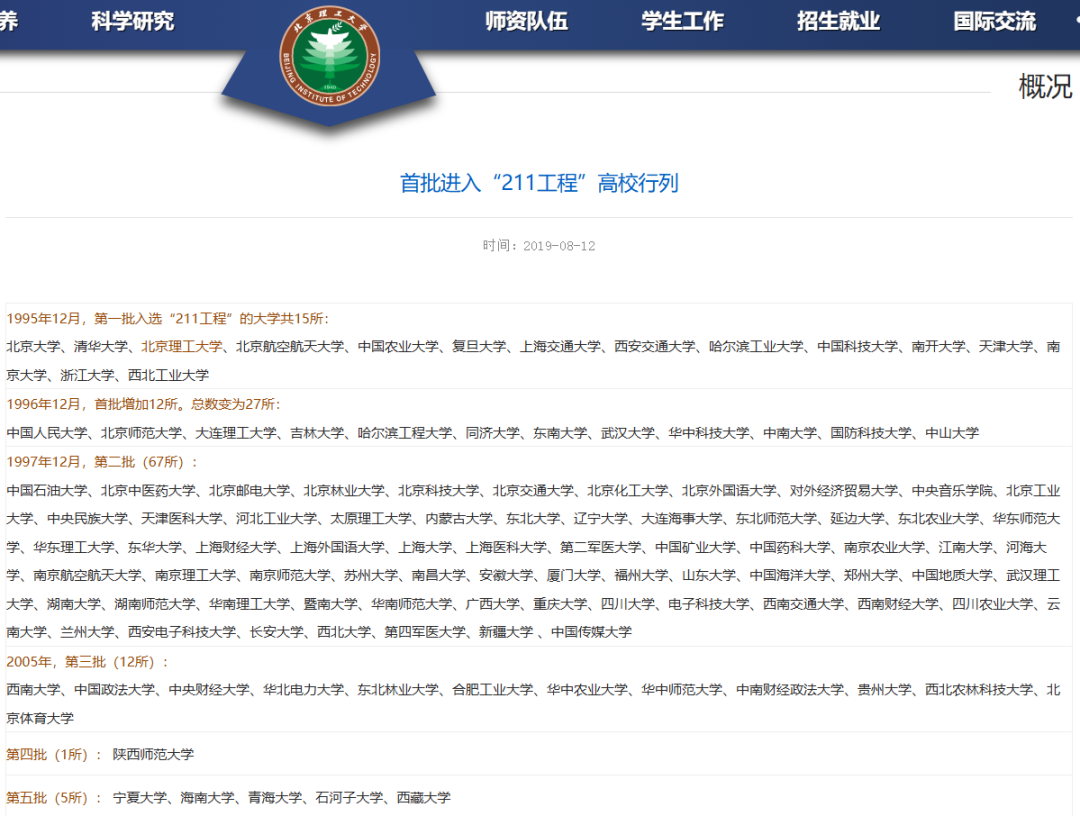 上图是北京理工大学官网上,关于211大学入选时间的介绍。它的存在,为这个传说背了书。