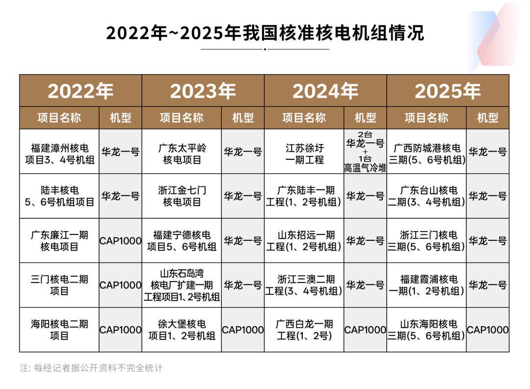 每经记者不完全梳理发现,自2022年以来,我国连续四年每年核准10台以上核电机组。并且,以我国具有完全自主知识产权的第三代核电技术“华龙一号”为主。从技术路线来看,除2024年获核准的江苏徐圩一期工程采用“华龙一号”(三代核电技术)机组与高温气冷堆(四代核电技术的代表性堆型之一)机组相耦合模式外,其余均采用我国自主三代核电技术。