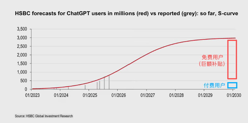 即便到了 2030 年 OpenAI 能实现 2-3 亿不等的付费用户,OpenAI 仍然需要支付巨额的算力成本去补贴其余 27-28 亿使用 ChatGPT 的免费用户。