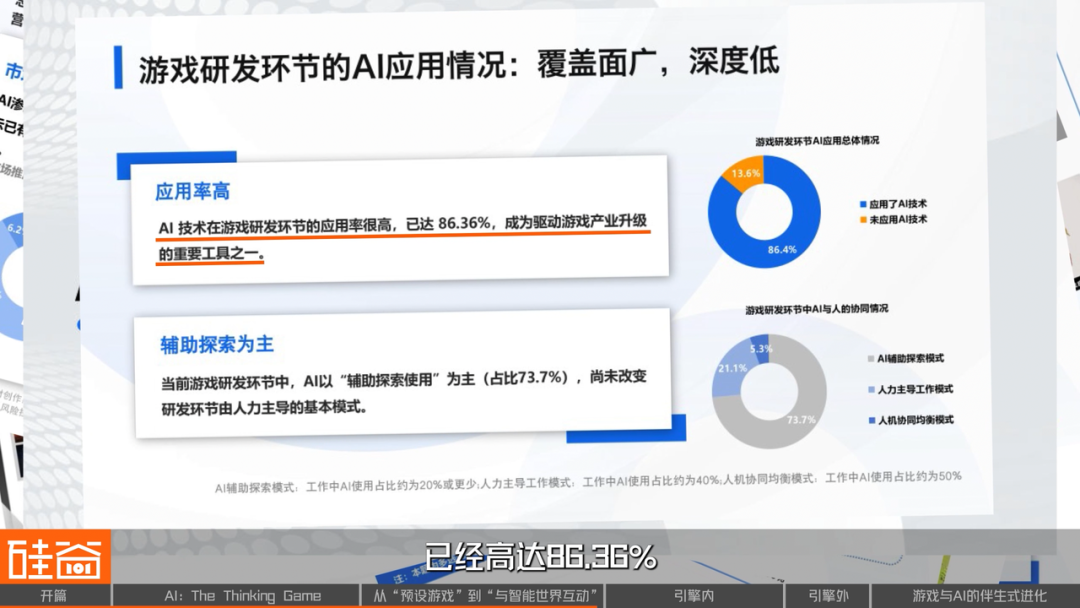 过去几年,由于大语言模型还是以文字为主,它在游戏开发上的应用主要局限在美术设计参考上。但随着AI多模态能力的爆发,AI则可以大幅降低创意门槛,将开发者的想法直接投射到宏大的游戏世界里。根据游戏工委最新发布的研究显示,AI目前在游戏研发中的应用率已经高达86.36%。