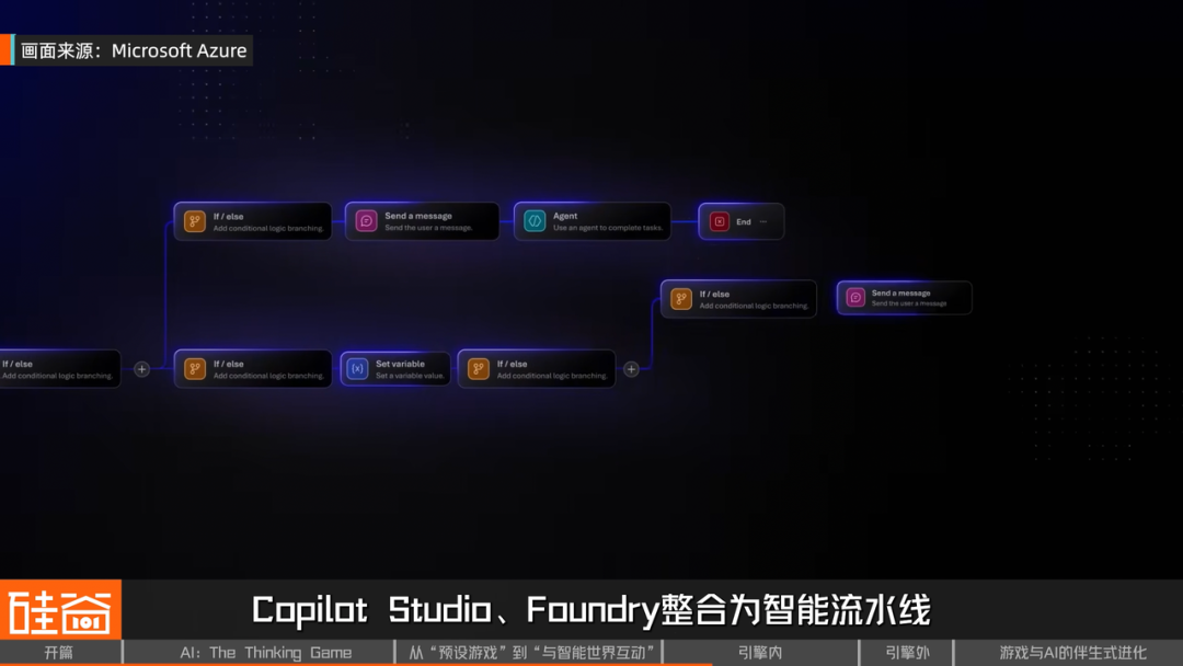 在引擎内,AI首先改变的是开发过程本身,一些原本高度依赖工程经验的工作,都可以由AI辅助完成。比如微软在2025年就提出了“AI工厂”的概念:将Copilot、Copilot Studio、Foundry整合为智能流水线,让开发者从编写代码转向使用AI代理完成全流程任务。