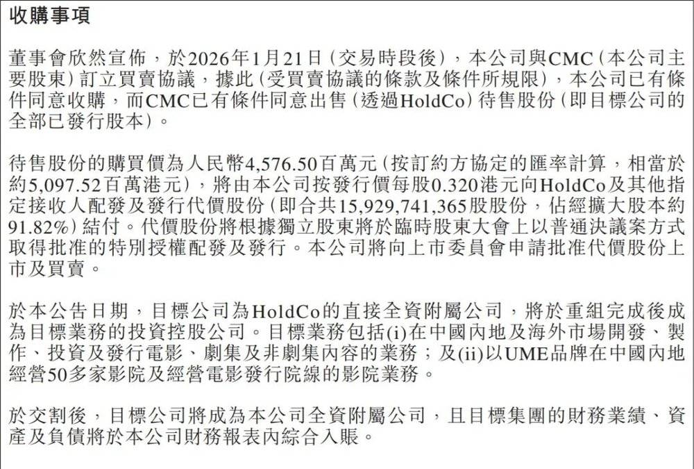 根据公告显示,邵氏兄弟将以45.765亿元人民币的价格,收购华人文化(CMC)旗下核心影视资产,其中包括剧集制作龙头正午阳光50%股权、电影投资与制作公司上海华人影业100%股权、海外发行业务平台CMC Pictures、影视发行业务平台同乐影视、综艺节目制作公司日月星光传媒,以及旗下拥有超过50家UME高端影院的上海思远等。