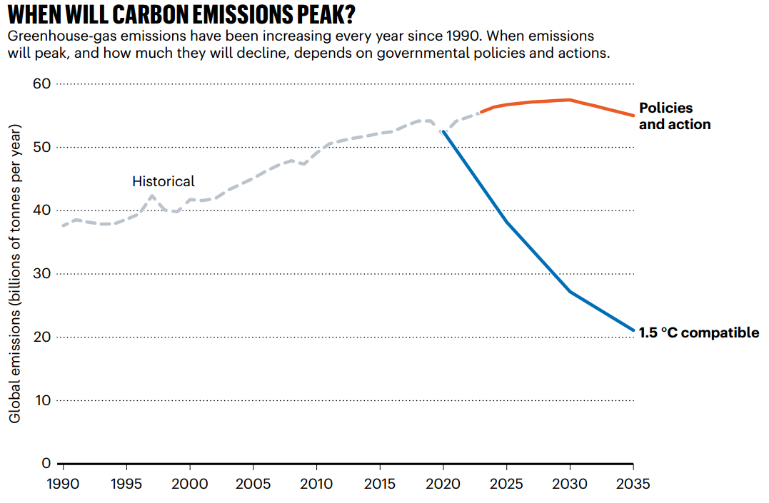 「Historical(历史线)」:1990年到现在的真实排放数据,一路向上走——文章里说,这期间排放量每年都在涨,现在比2015年《巴黎协定》签的时候还高10%,就像爬山一直没停脚。