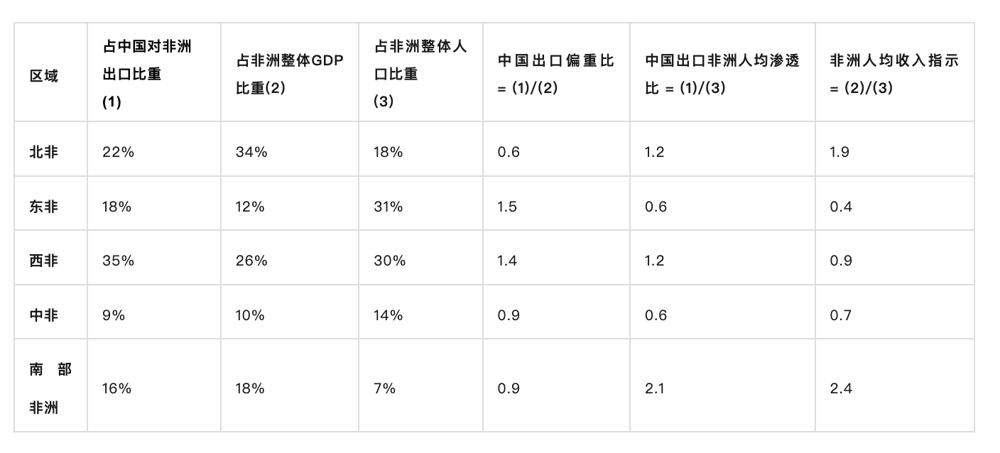 中国出口偏重比:区域对华进口的占比,除以该区域在全非洲 GDP 的占比。大于1叫超配,说明中国货在这片市场里的话语权更足。小于1叫低配,需要靠本地化或差异化补回份额。
