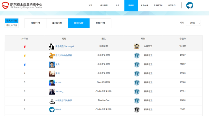 白色鼠标获得JSRC(京东安全应急响应中心)2025年年榜第二