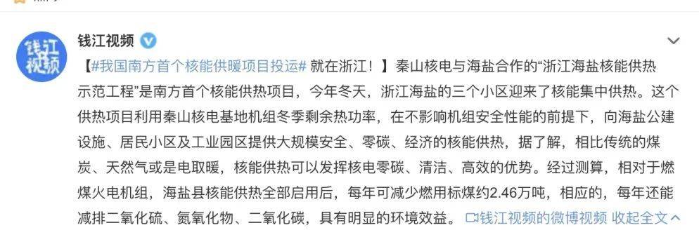近日,“浙江海盐三个小区集中核能供暖”的消息冲上了微博热搜。