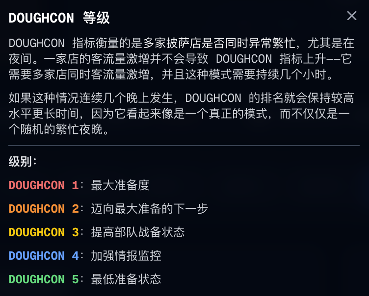 可以说这东西几乎就是披萨指数运用的终极形态了,它把披萨店的热度、曲线、时间点全都汇总成了一个叫“面团指数”(DOUGHCON)的警报系统。