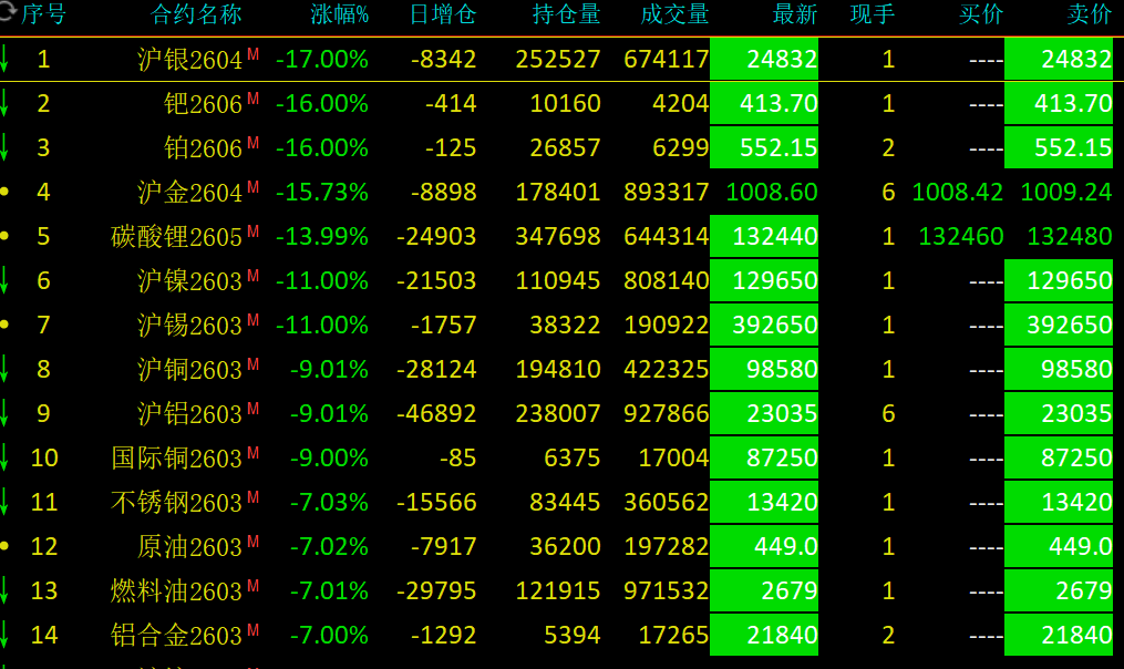今天(2026年2月2日)国内期货市场经历了近期罕见的单边大幅下跌,整体走势呈现恐慌性抛售、板块普跌、贵金属领跌的显著特征。