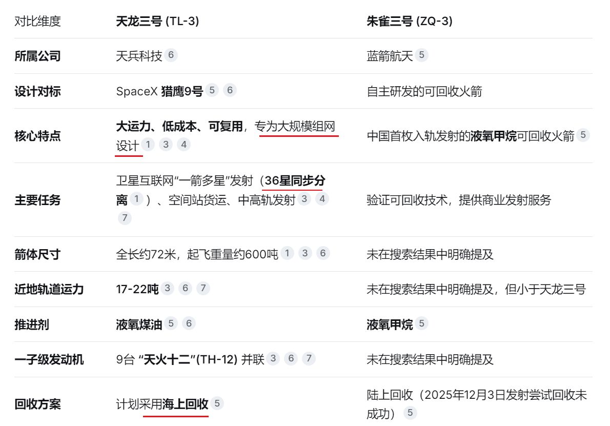 天龙三号是目前国内最像猎鹰9号的火箭。两者都选择了技术成熟度高、供应链稳定的液氧煤油路线,目标都是实现火箭一级的垂直回收和重复使用,这是降低发射成本的关键。发动机性能有细微差距:天龙三号的“天火12”发动机与猎鹰九号的“梅林1D”在海平面推力上相当,但在衡量燃料效率的比冲和推重比上,经过多次迭代的“梅林1D++”仍略有优势。不过,“天火12”通过广泛应用3D打印技术来减重和简化结构,正努力追赶。