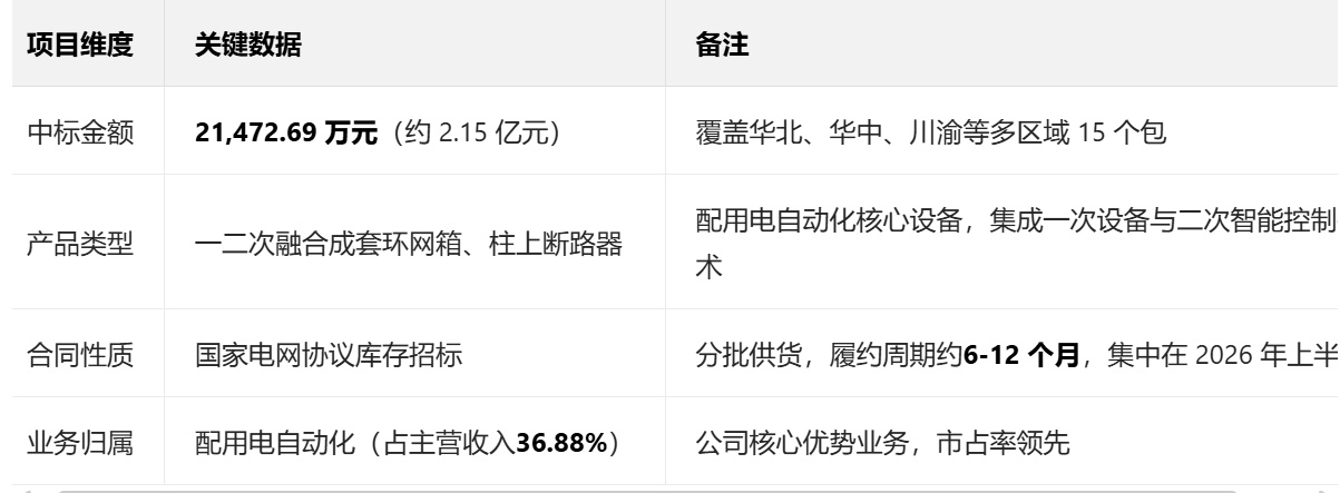 据2025年12月11日公告,公司中标国家电网华北、华中及川渝区域一二次融合成套环网箱等15个包,金额约21,472.69万元,合同履行将对业绩产生积极影响。