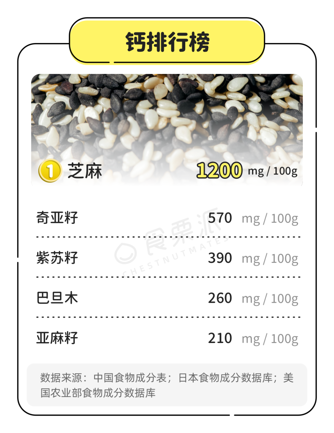 芝麻、奇亚籽、紫苏籽、巴旦木、亚麻籽位居“钙榜”前五位,钙含量是牛奶(110mg/100g)的数倍。
