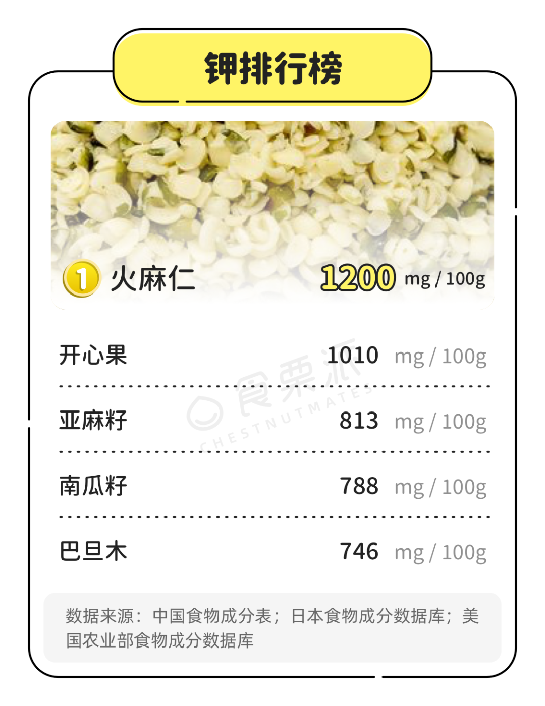 除了上榜的5位,松子、花生、奇亚籽、榛子、杏仁的钾含量也都很丰富,在600mg/100g以上。