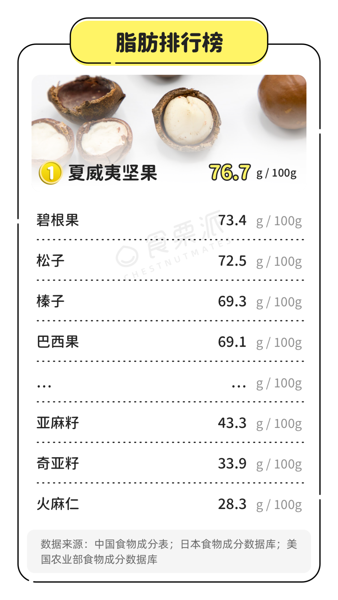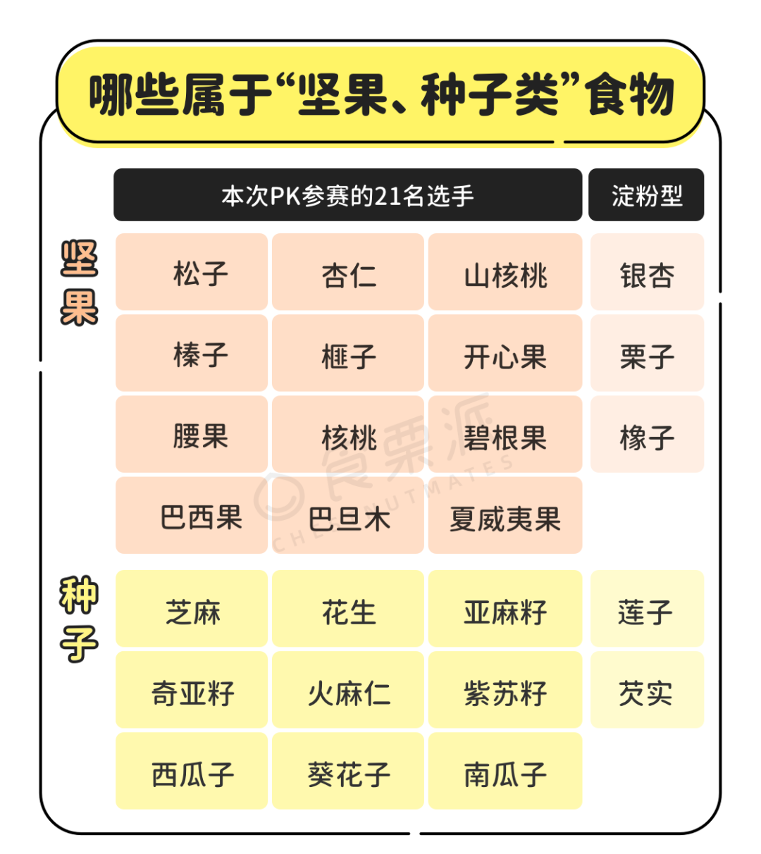 橡子、莲子、芡实、银杏(白果)也是各种植物的种子,但它们的营养组成有很大差别:脂肪少(<3%),淀粉多,更接近主食。所以,这里就不放在一起比较了。