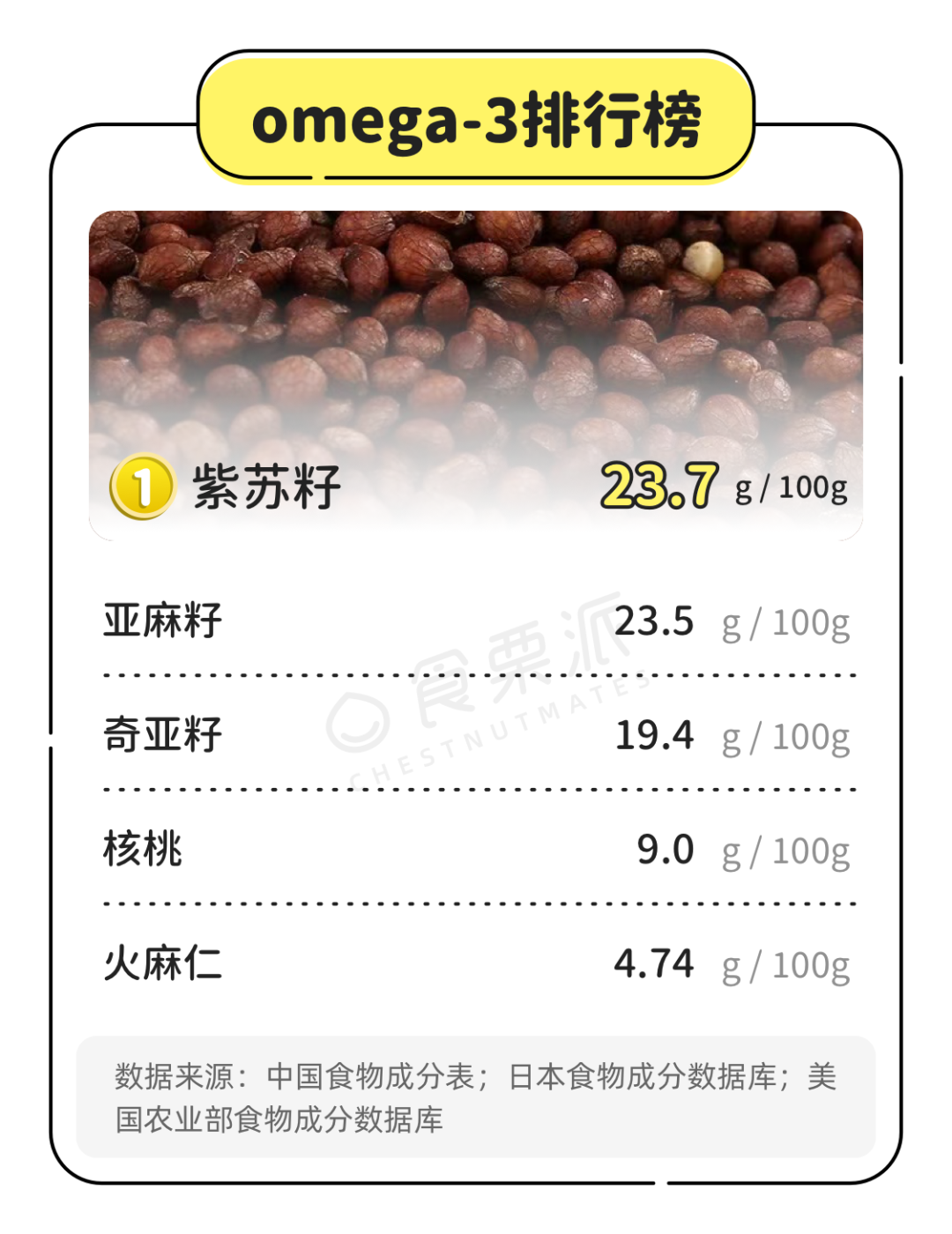 富含α-亚麻酸的坚果比较少,也就紫苏籽、亚麻籽、奇亚籽值得拿出来说说;再有就是核桃,其他的就根本不值得一提。