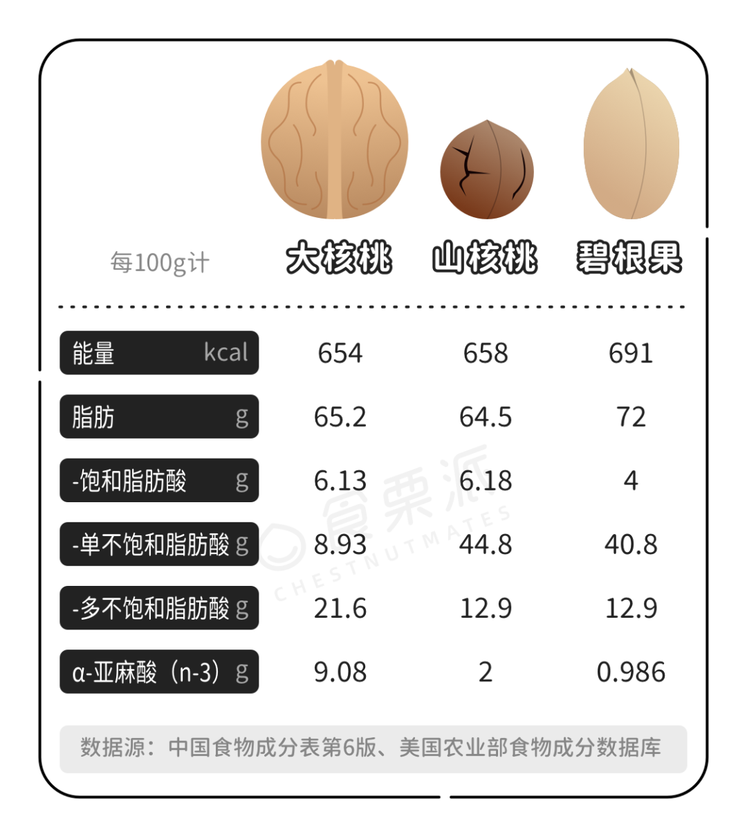 咱们常吃的3种核桃:大核桃、小核桃(临安山核桃)、美国山核桃(碧根果),大核桃的脂肪酸组成明显不同于其他两种。