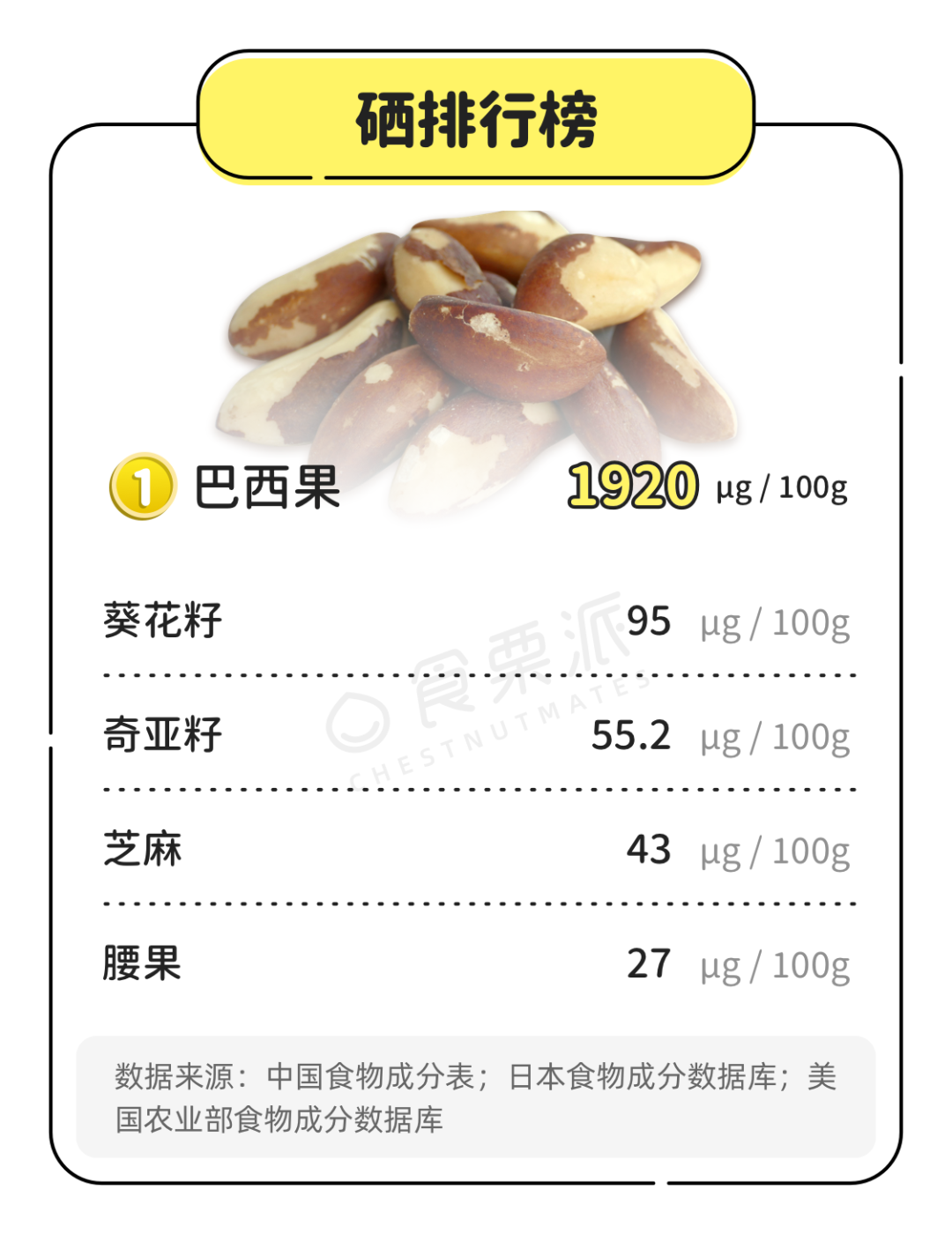 根据中国居民膳食营养素参考摄入量,硒的每日推荐摄入量是60μg,最高可耐受摄入量400μg。所以不要吃太多,一天吃一两颗就够了。👉关于巴西坚果的重要提醒