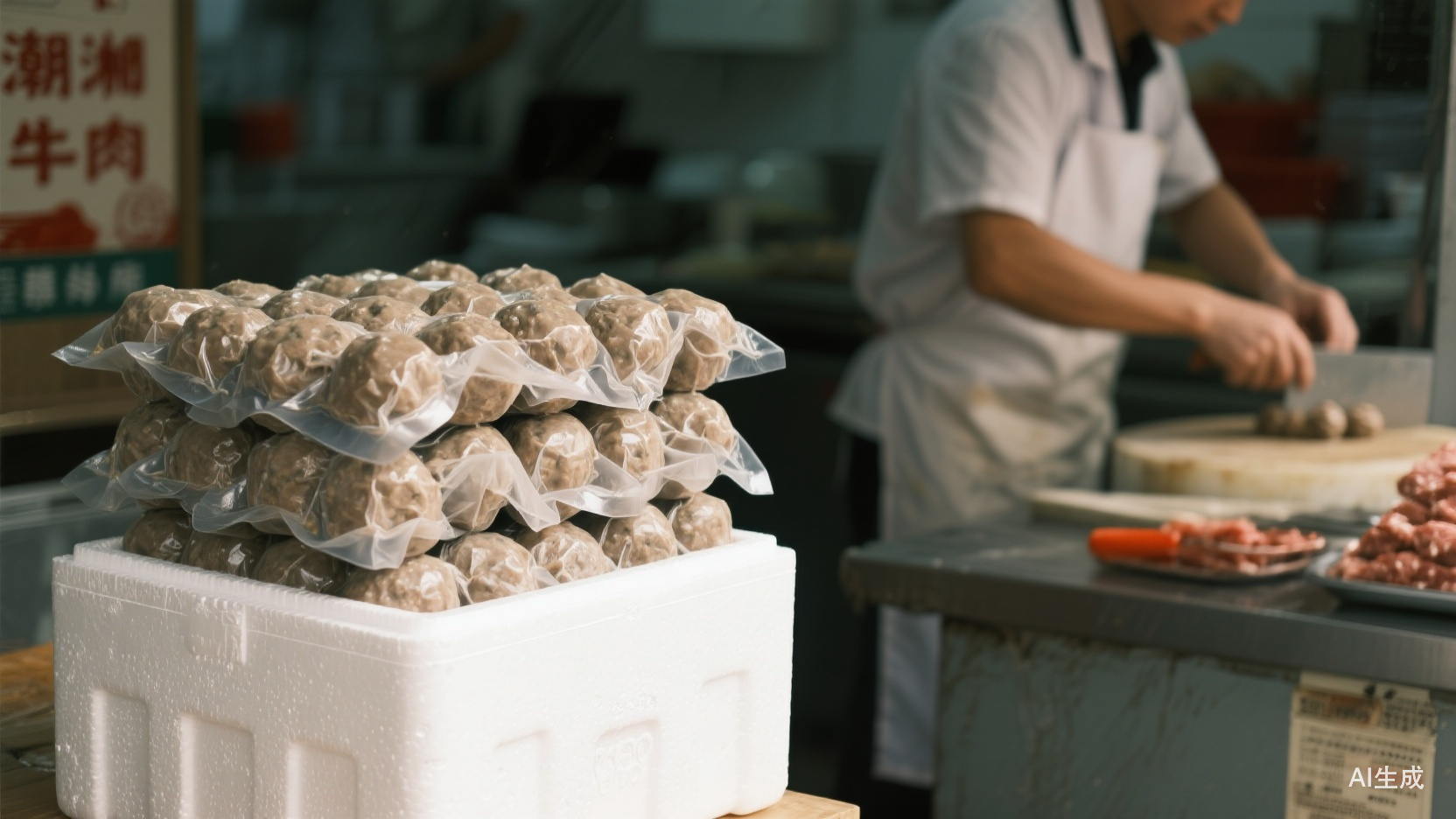 不规则圆形的、灰色外壳的、弹牙的、带着纯肉奶香味的牛肉丸,还有些一口爆汁的牛筋丸,一起被装进透明的塑料袋里,抽成真空状态后配着冰块放在泡沫箱内。