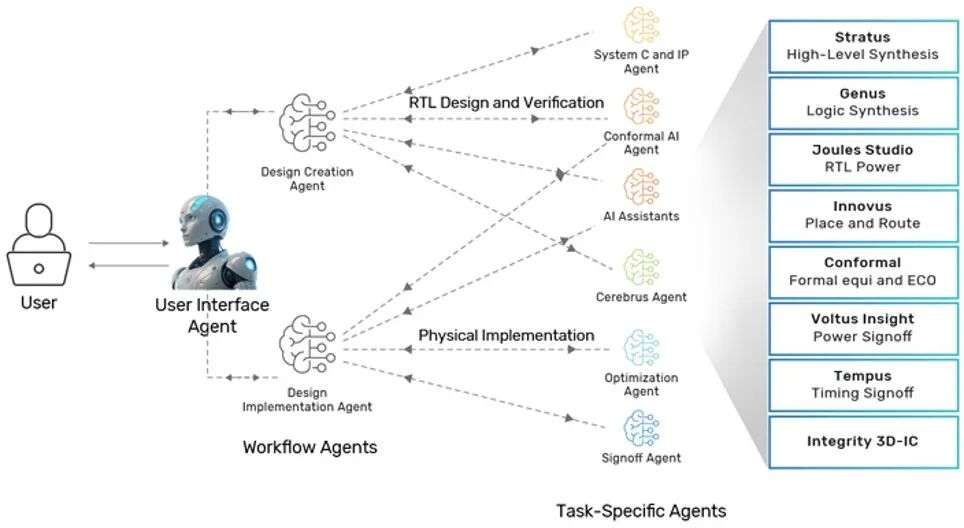 想象一下,你只需要在对话框里输入一句话:设计一颗3nm的AI加速芯片,功耗300W,性能对标H100。然后,智能体自动调用前端设计工具写RTL,自动跑综合、验证、布局布线、签核,最后吐给你一个GDSII。
