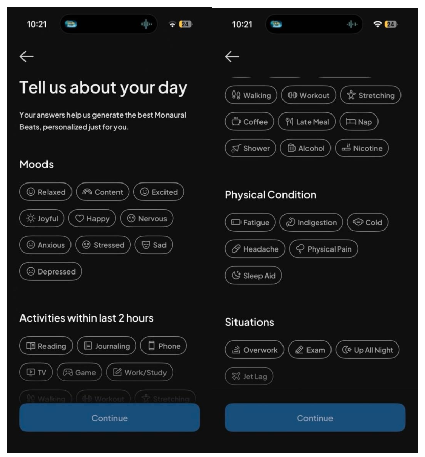 上图为每次用户打开 Nightly 需要点选的问题,包括当下的心情、生理状态、睡前 2 小时的活动,以及近期的状态等。经过笔者的测试,用户的选择会影响音频的内容,比如,笔者选择了比较平静的心情及活动,就会直接播放单声道节拍音频,引导睡眠;但如果选择了“Excited、Happy”和“Game、Workout”等标签的话,Nightly 会先播放一段 10 分钟左右引导冥想的音频,让用户先放松下来,再播放单声道节拍音频。