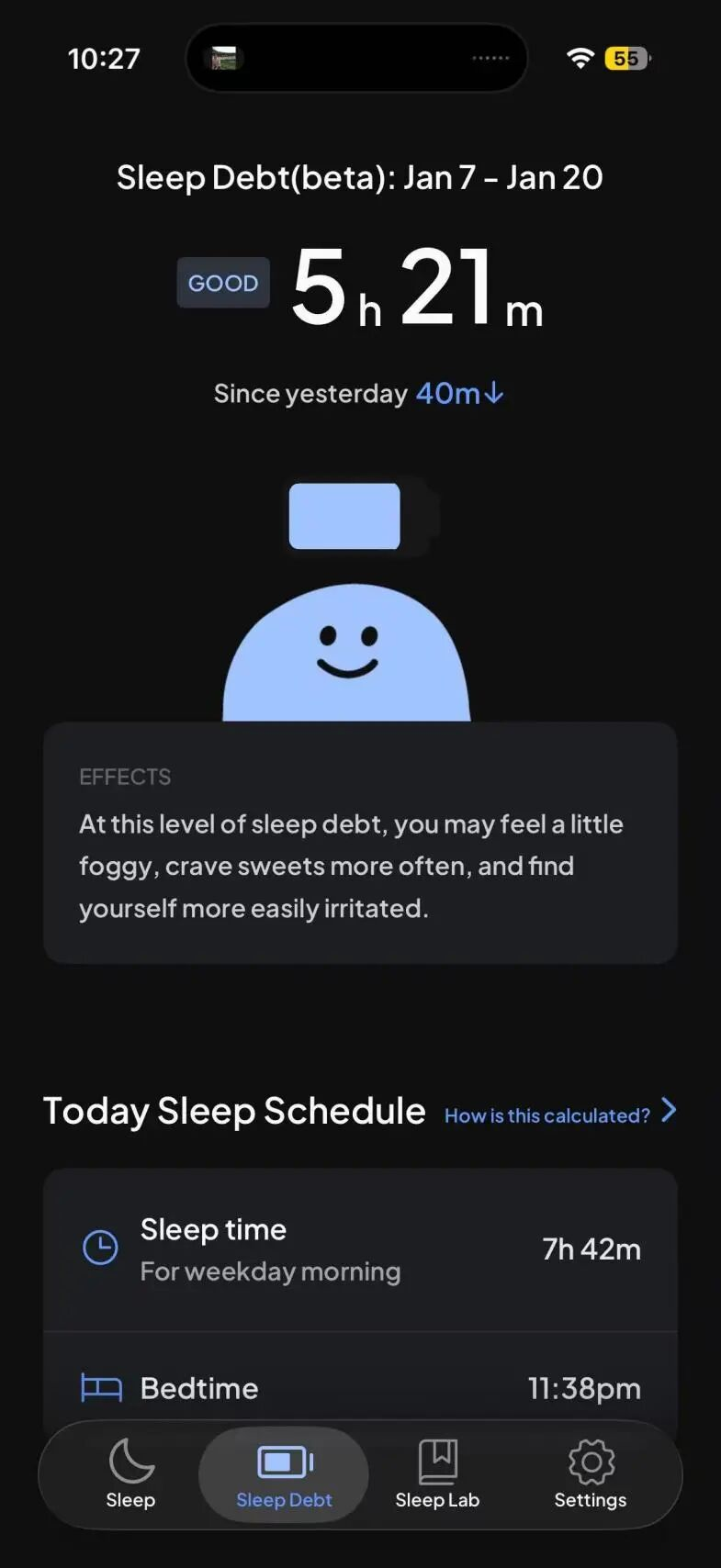 后续,Nightly 还会在用户睡醒后给出一份睡眠分析报告,告诉用户睡眠质量如何,并引入了“睡眠债”的概念,让用户近一段时间的监控睡眠质量。