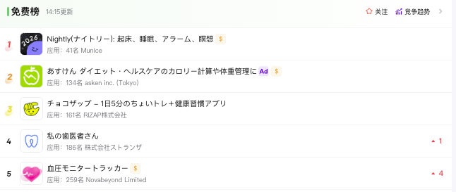 日本 iOS 健康健美下载/畅销榜,Nightly,分别位列 1、3 位|图片来源:点点数据