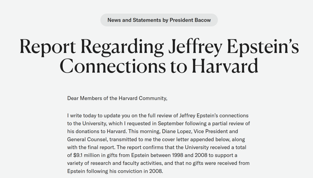■2020年5月哈佛就与爱泼斯坦的关系和捐赠发表了声明:1998年至2008年间,哈佛大学共收到爱泼斯坦910万美元的捐款,爱泼斯坦于2008年被定罪后,哈佛大学未再收到他的任何捐款